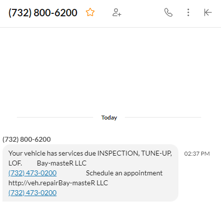 Among the regular services due, automatic reminders can help you with getting reviews, reminding your customers of their appointments, or just saying thank you to your customers for their business! Sometimes all you need to get your customers in the door or make them feel appreciated is a simple text. Let Bay-Master take care of that for you today.