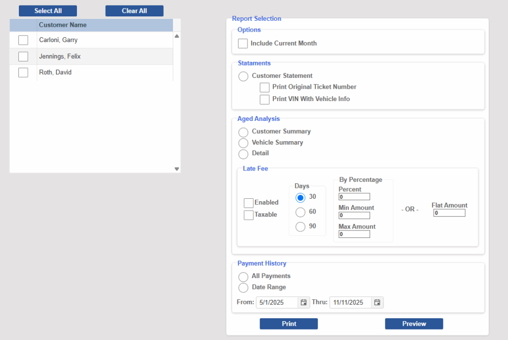 Bay-Master’s accounts receivable reporting keeps it simple. On one page, pick who you need a report for, what kind of report it is, and we take over from there! Whether it’s a simple statement to let your customer know what they owe or a detailed report for you to see any patterns of bad standing, we have you covered.